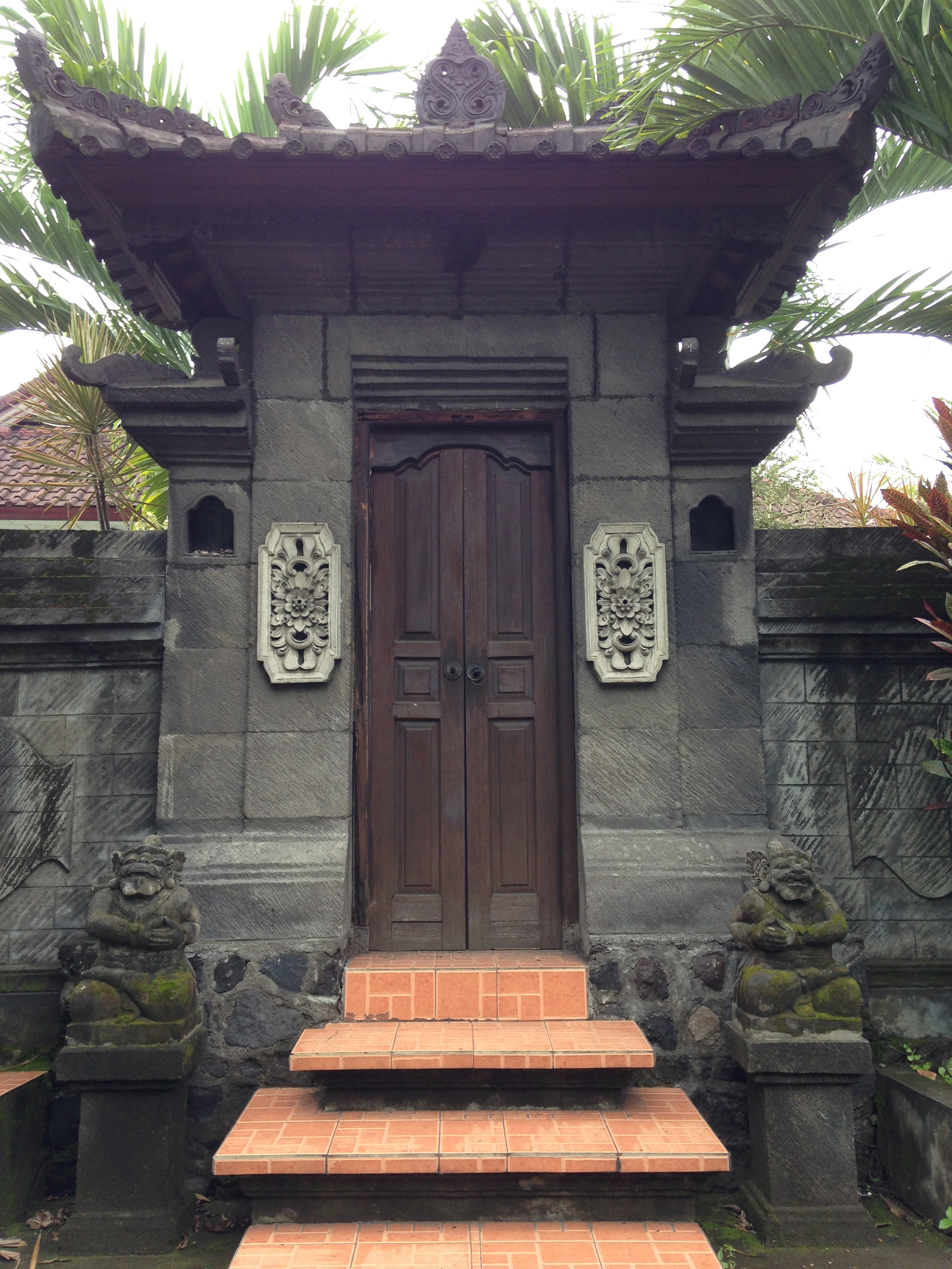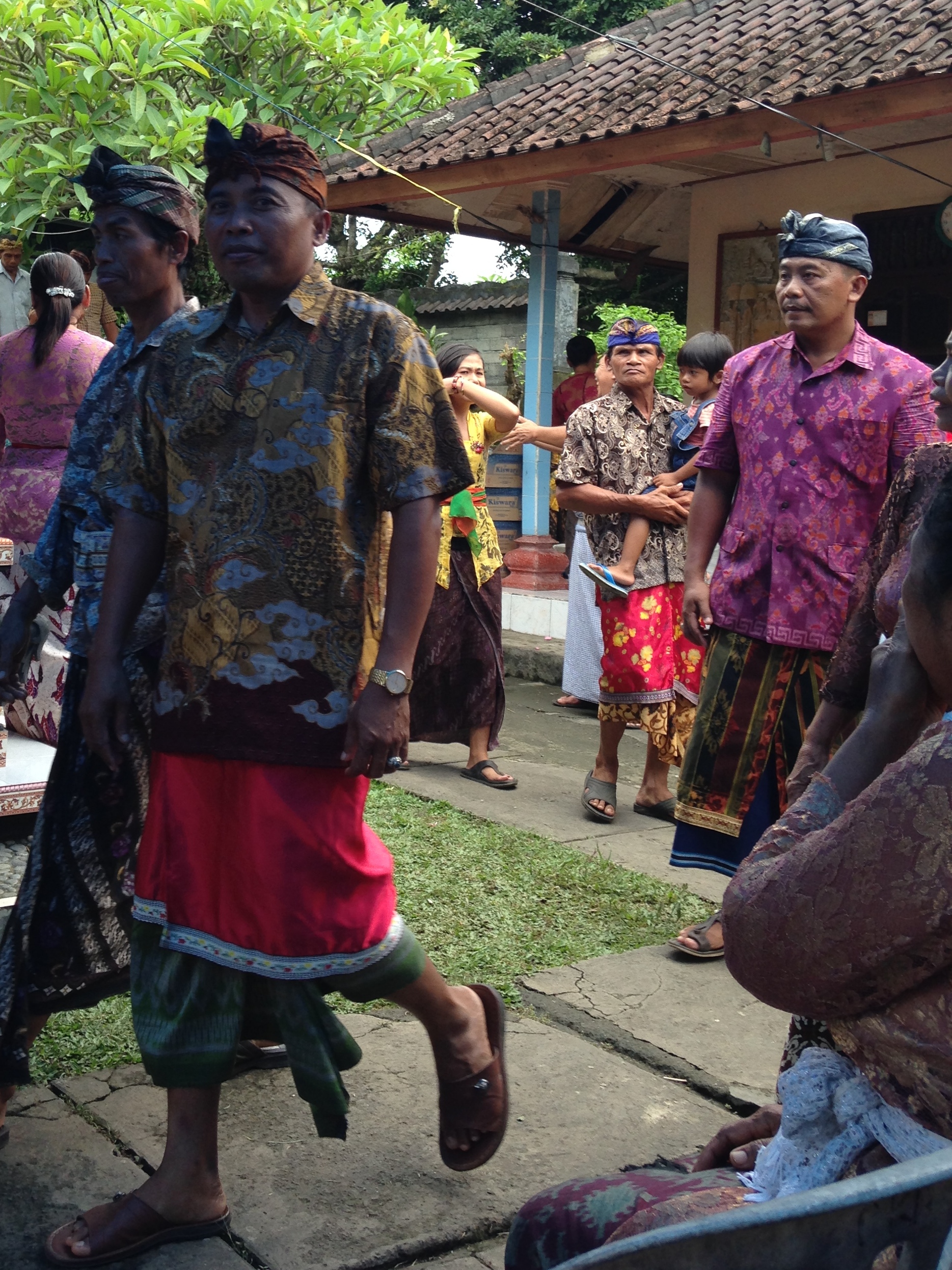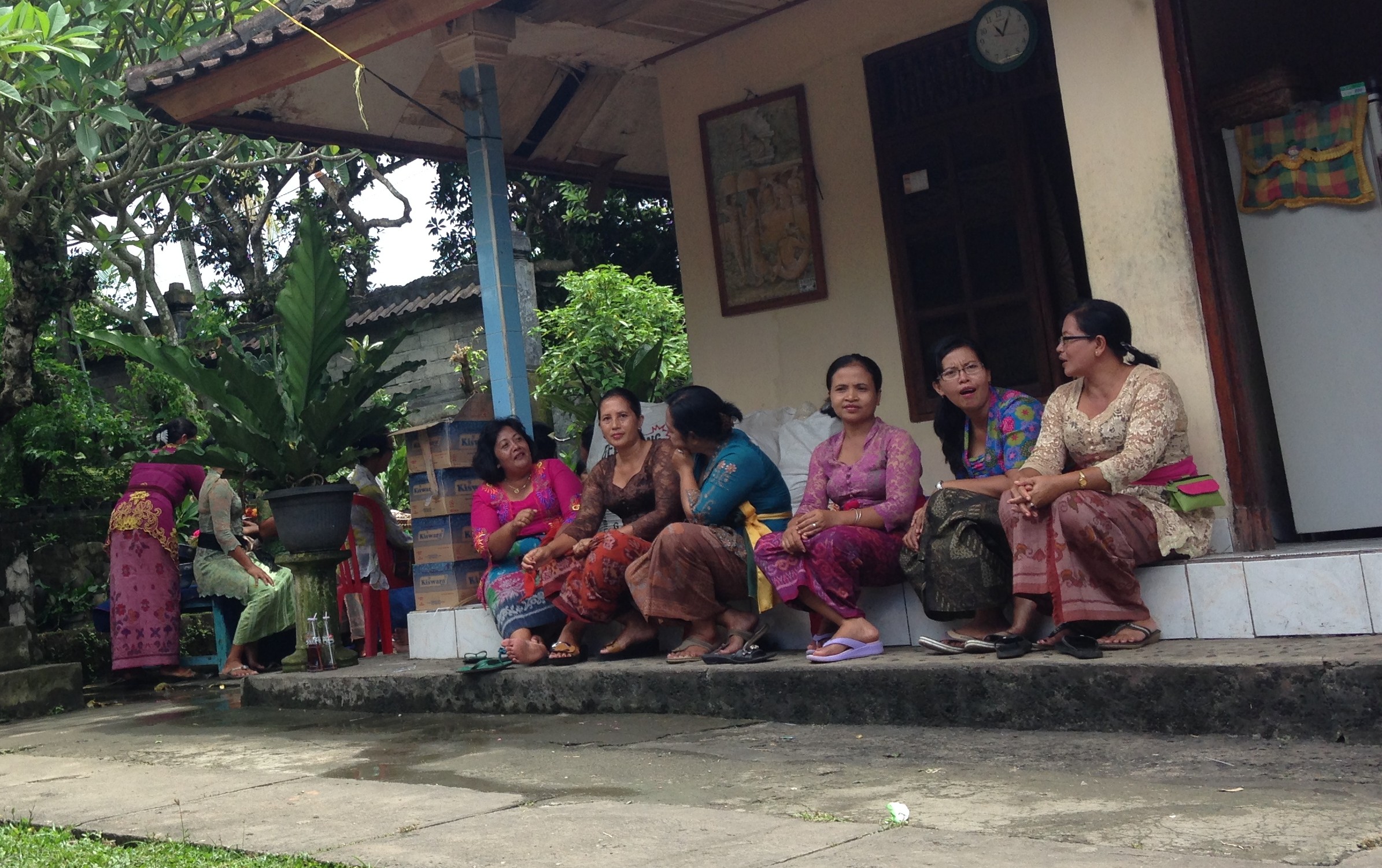 It was a short walk to Wayan’s family home, but the steamy air poached us quickly in our sausage-wrap getups. By the time we arrived at the walled compound, Chris was mangosteen red and I was beginning to understand the merit of being half naked from the waist up.