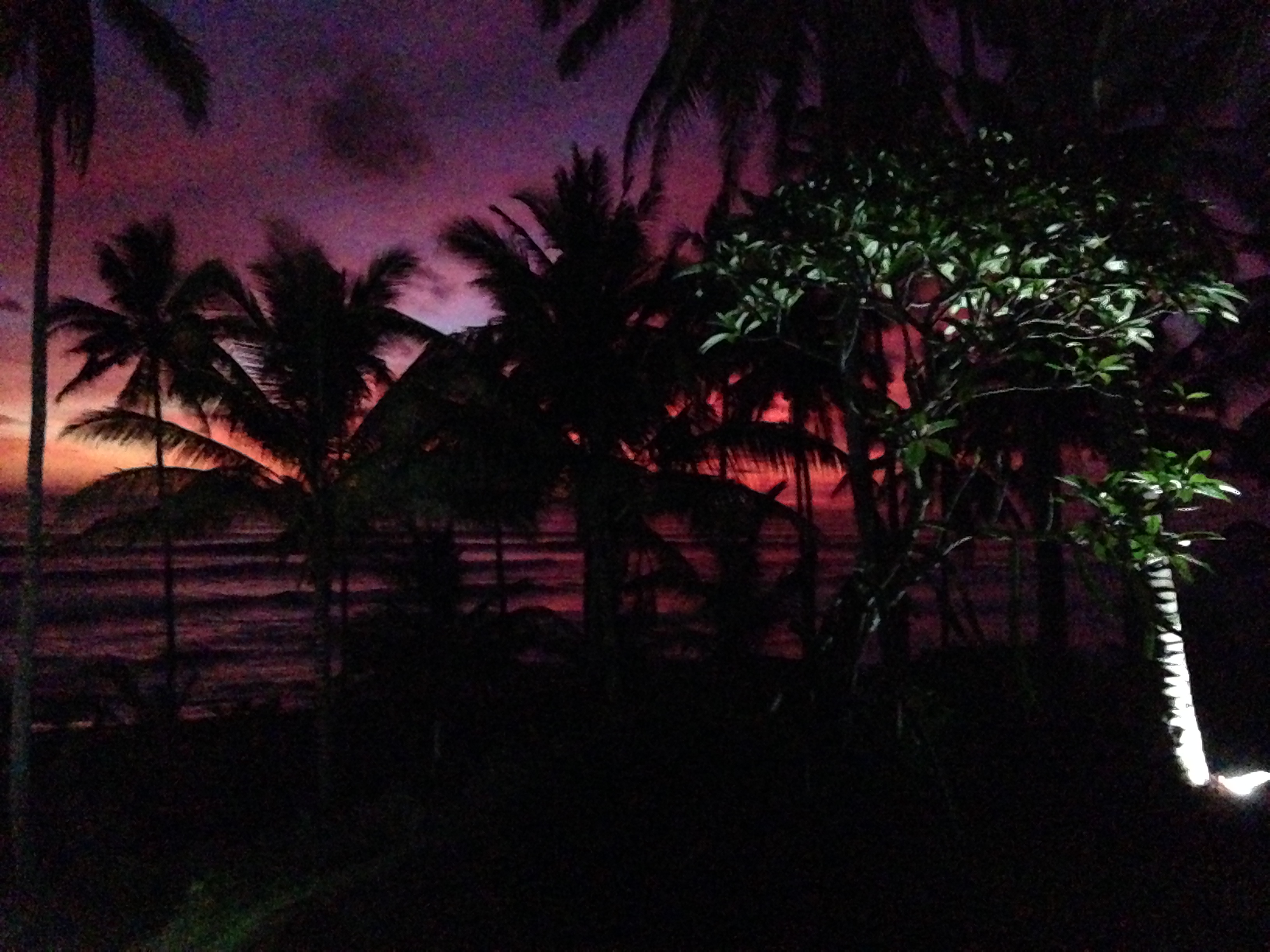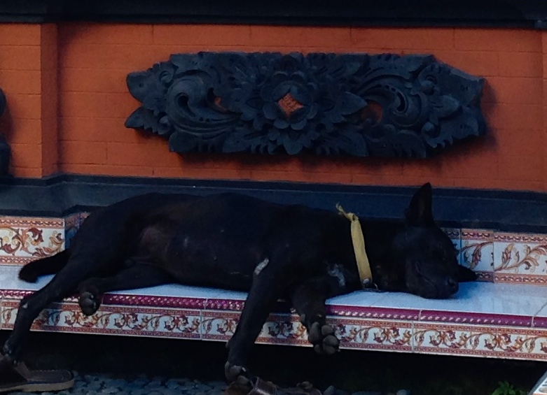 IMG_6030I plopped into my wobbly chair and we sat there mute while a toddler squealed at his handheld video game. Its chimes and dings and boings had Chris poised for intergalactic flight, and he began to make vague threats under his breath about what he would do to the toy if he got his hands on it. Meanwhile, I empathized with a dog passed out on the pavilion steps. No doubt he felt the same way about his hot black fur as we did about our thick cotton sarongs. The poor thing couldn’t even be bothered to act like a hunter and chase the chickens around.