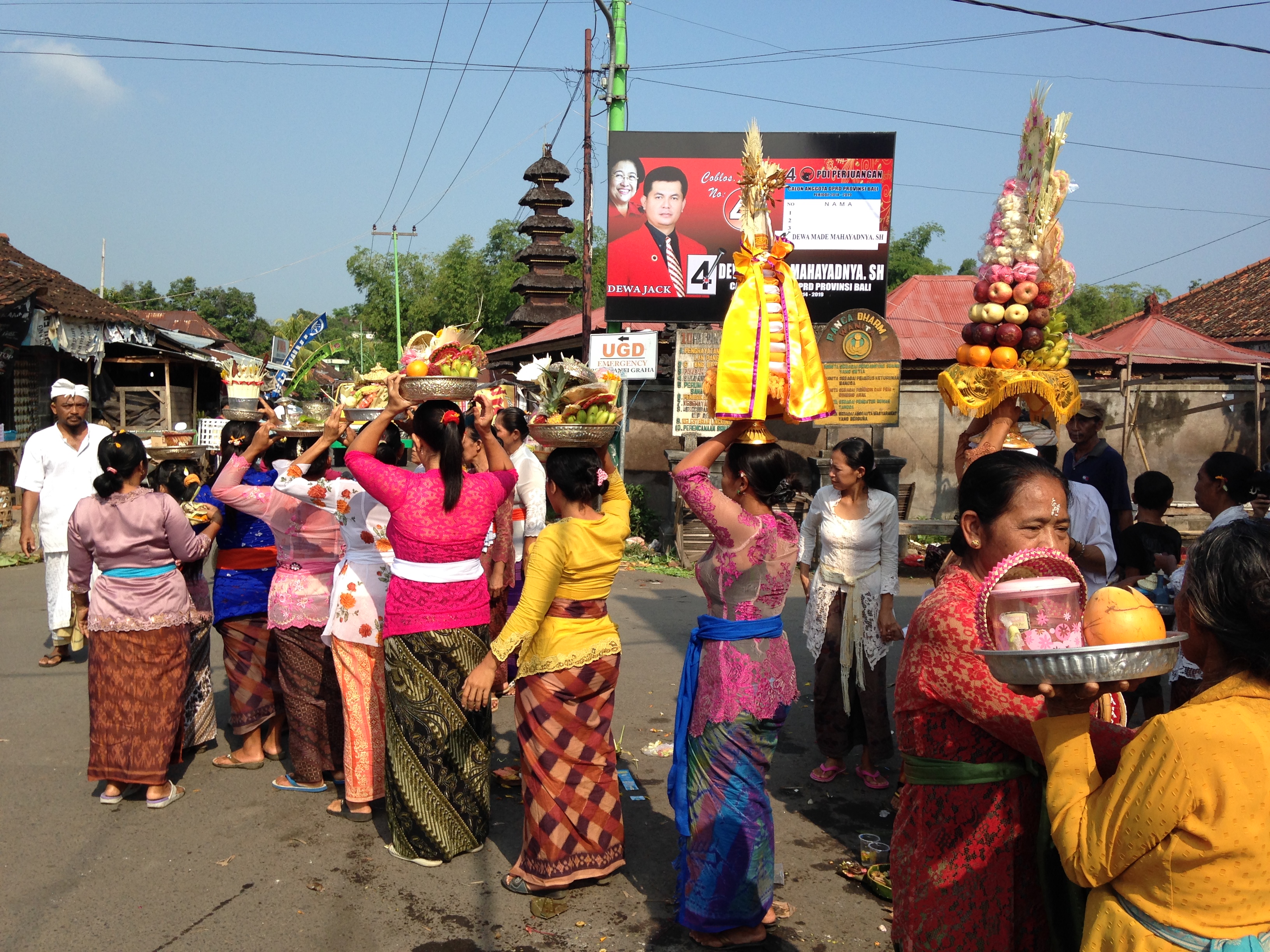 IMG_5896Sitting regally in the first row of several plastic chairs was Wayan in full ceremonial dress. Her hair was piled high atop her head, with the help of a hairpiece, and crowned with a garland of small pink roses. Unfortunately, the heat and humidity had had its way with her makeup, and her heavily powdered nose was starting to resemble melted cookie dough. I felt bad for her having to sit alone, on display, trying not to wilt.